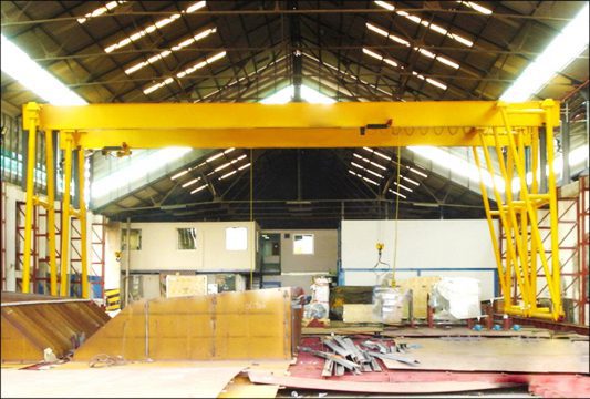 [/vc_column_text][/vc_column][/vc_row][vc_row][vc_column][vc_column_text]1.เครนสนามขาสูง 2 ข้าง : แบบคานเดี่ยว (GANTRY CRANE : SINGLE GIRDER)[/vc_column_text][vc_single_image image=”16826″ img_size=”medium” alignment=”center”][vc_column_text] เครนสนามขาสูง 2 ข้าง แบบคานเดี่ยว มีความเหมาะสมใช้ติดตั้งบนพื้นที่กลางแจ้ง และในร่มใต้หลังคาโรงงาน สำหรับโรงงานที่ไม่ได้เตรียมโครงสร้างเสาไว้เพื่อรับเครนเหนือศีรษะ ซึ่งมีความจำเป็นต้องติดตั้งเครนสนามขาสูง 2 ข้าง วางบนพื้นโรงงาน และลักษณะเช่นเดี่ยวกับเครนเหนือศีรษะแบบคานเดี่ยวที่มีความเหมาะสมสำหรับอุตสาหกรรมที่ใช้งานยกน้ำหนักไม่หนักมาก ควรมีความกว้างใช้งานตั้งแต่ 6 -20 เมตร และควรมีน้ำหนักยกตั้งแต่ 0.1 ตัน – 12.5 ตัน เป็นมาตรฐาน ซึ่งใช้งานร่วมกับ รอกโซ่ไฟฟ้าคุณภาพสูง สำหรับเครนแบบคานเดี่ยวที่ออกแบบและผลิตเป็นมาตรฐานรุ่นต่างๆไว้แล้ว สำหรับใช้งานแขวนประกอบกับเครนชนิดนี้โดยมีความเหมาะสมและปลอดภัย ซึ่งเครนสนามขาสูง 2 ข้าง ถือเป็นเครนไฟฟ้าที่ได้รับความนิยมใช้กันไม่มากนักในการนำมาใช้ติดตั้งภายในตัวอาคารโรงงาน เพราะจะไม่สะดวกมากนักเมื่อเปรียบเทียบกับเครนเหนือศีรษะที่วิ่งอยู่บนรางวิ่งด้านบนหูช้างที่เชื่อมติดกับเสาโรงงาน เนื่องจากมีชุดขาเครนวิ่งที่วางอยู่บนพื้นที่ด้านล่างจะทำให้เสียพื้นที่ในการใช้งานทั้ง 2 ด้านของโรงงาน ตลอดความยาวของอาคารโรงงานไปทั้งหมดแต่ดังที่กล่าวไว้ด้านบนคือ เหมาะกับเรื่องที่ต้องแก้ปัญหาสำหรับโรงงานที่ไม่ได้เตรียมโครงสร้างเสาที่แข็งแรงไว้รองรับน้ำหนักเครนเหนือศีรษะ และรางวิ่งเครนด้านบน หรือเหมาะกับงานที่ต้องการใช้ยกวัตถุหรือสินค้ากลางแจ้งที่ไม่ต้องการสร้างโครงสร้างโรงงาน แต่ผู้ติดตั้งเครนก็จะต้องเตรียมงานฐานรากและคานใต้ดินไว้อย่างแข็งแรง เพื่อรองรับรางวิ่งเครนเช่นกัน เพราะเครนสนามขาสูงมีน้ำหนักกดลงบนรางมาก และต้องวิ่งบนรางวิ่งที่มีระดับเท่ากัน และแนวตรงตลอดทาง ซึ่งถ้าฐานรากใต้รางวิ่งไม่แข็งแรงพอก็ทำให้รางเครนทรุดตัว และชุดโครงสร้างเครนอาจมีปัญหาเกิดขึ้นได้ สิ่งสำคัญเครนสนามขาสูง 2 ข้าง แบบคานเดี่ยวไม่ควรทำขนาดความกว้างของชุดคานเครนเกินกว่า 20 เมตร และน้ำหนักยกเกินกว่า 12.5 ตัน หรือใช้ความเร็ววิ่งตามแนวยาวเกินกว่า 25 เมตร/นาที เพราะเนื่องจากเป็นเครนแบบคานเดี่ยว และตัวเครนยกขาสูง 2 ข้าง ถ้าออกแบบเครนกว้างเกินไป โดยใช้ยกน้ำหนักที่มากหรือเคลื่อนที่เร็วเกินไป เมื่อเกิดความฝืดของล้อกับพื้นผิวรางวิ่งหรือระดับรางทั้ง 2 ด้านไม่เท่ากัน ทำให้ขาเครนทั้ง 2 ด้านออกตัวไม่เท่ากัน ถ้าออกแบบโครงสร้างคานเครนไม่แข็งแรงนัก จะเกิดปัญหากั