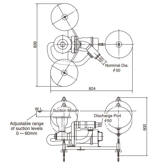 The FSP-series is a floating scum skimmer designed for the collection of floating scum in the wastewater treatment. It consists of a submersible pump, jet-injector mechanism, and three floats. The jet-injector mechanism ensures stable suction operation even if water, air and scum are drawn simultaneously. As it is a floating type, the suction mouth can keep its relative position with the water surface, which prevents operation failure due to changes in the water level. The suction mouth can be adjusted to a depth between 0 to 60mm, so that the skimmer can efficiently suck scum with minimal amount of water. Adjustment of the depth can be done by turning the floats to right or left.