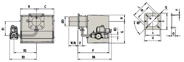 | Model | B | C | ØD | E | F | G | H | I | L | M | N | O | P | Q | S | U | TC | TL | R1 | R2 | R3 | R4 | RD |