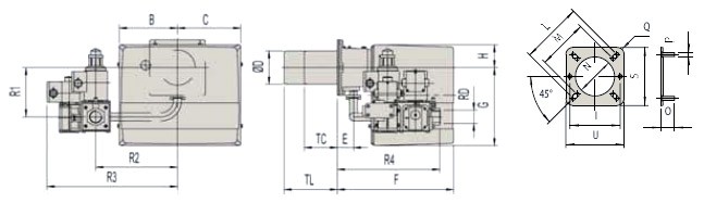 | Model | B | C | ØD | E | F | G | H | I | L | M | ØN | O | P | Q | S | U | TC | TL | R1 | R2 | R3 | R4 | RD |