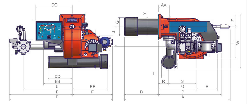 All burners with progressive for modulating operation, have been built to burn oils whose standard viscosity is 50 cSt at 50 °C (7 °E at 50 °C). Upon request it is available the version for heavy oils up to 400 cSt at 50 °C (50 °E at 50 °C). In order to keep the oil fluid, the burner is provided with a pre-heating tank equipped with low thermical load electrical resistance. Each system can be further distinguished by the equipment provided: