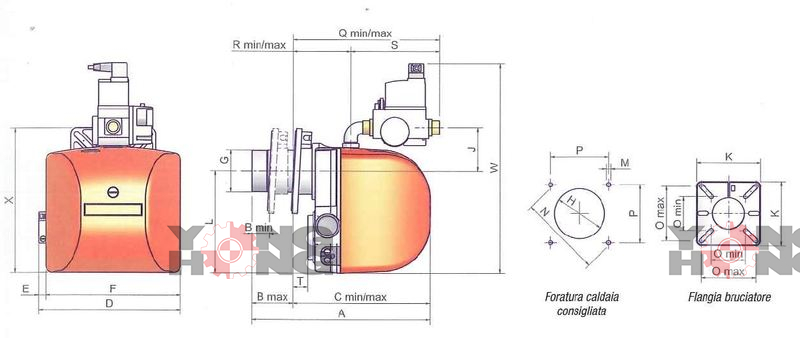 | Burner type | Model | Power [min, kW] | Power [max, kW] | Gas flow [min, Smᶾ/h] | Gas flow [max, Smᶾ/h] | Gas pressure [max, mbar] | Voltage [V] | Phases / frequency [Hz] | Total power [kW] | Fan motor [kW] | Power supply [aux, kW] | Protection class IP |