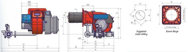 | Burner type | Model | Power [min, kW] | Power [max, kW] | Gas flow [min, Smᶾ/h] | Gas flow [max, Smᶾ/h] | Gas pressure [max, mbar] | Voltage [V] | Phases / frequency [Hz] | Total power [kW] | Fan motor [kW] | Power supply [aux, kW] | Protection class IP |