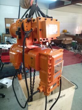 The RHINOS RHFB Series is an explosion-proof electric chain hoist (2.4 directions) from a Taiwanese brand. It is certified with Exde IIB T4 G6 standards and has temperature control and fire leak prevention features. It is designed for easy installation and enhances safety in high-risk environments. It is popularly used in petrochemical factories, petroleum refineries, as well as industrial gas production sites, mines, oil distilleries, industrial gas treatment facilities, alcohol production factories, and color-related manufacturing plants.