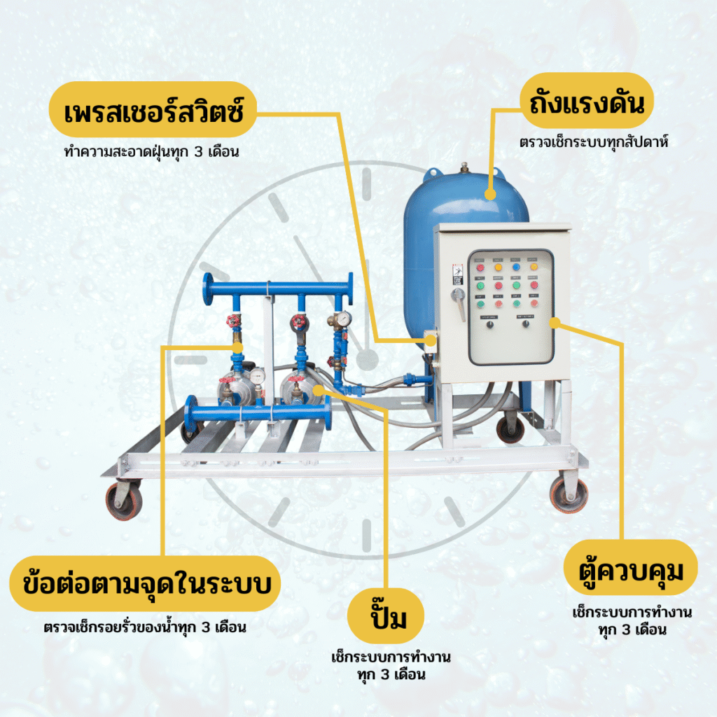 3 เดือน: ตรวจแรงดัน, รอยรั่ว, เสียงและแรงสั่นของปั๊ม, การทำงานของ Pressure Switch และ Pressure Tank