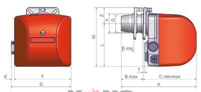 | Burner type | Model | Power [min, kW] | Power [max, kW] | Oil flow [min, kg/h] | Oil flow [max, kg/h] | Voltage [V] | Phases / frequency [Hz] | Total power [kW] | Fan motor [kW] | Power supply [aux, kW] | Protection class IP |
