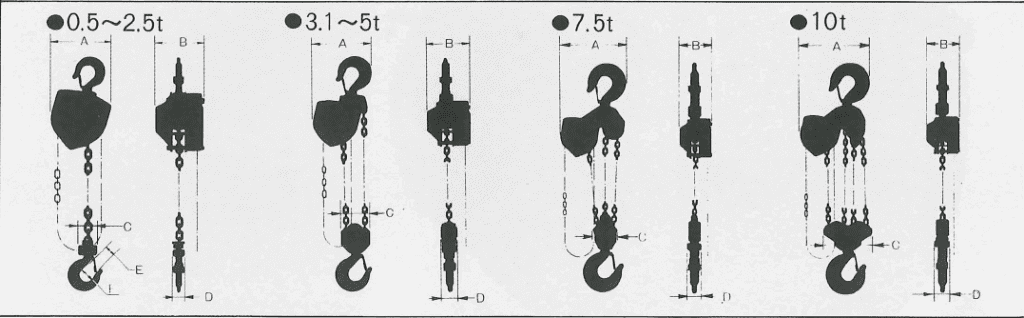 | รุ่น | รับน้ำหนัก | ระยะยก | ขนาดโซ่ยก | ขนาดโซ่ดึง | น้ำหนักเครื่อง |