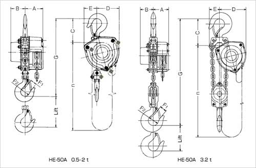| Item no. | Rated load (t) | Standard lift (m) | Pulling effort (N) | Min. headroom G (mm) | Net weight (kg) | Test load (t) |
