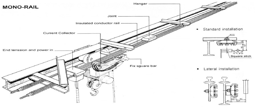 รางไฟฟ้า Tro-Reel อุปกรณ์ไฟฟ้าสำหรับเครน สำหรับจ่ายกระแสไฟให้กับรอกไฟฟ้าและเครนไฟฟ้า โดยติดตั้งกับทางวิ่ง การใช้งานคงทนและถาวรกว่าสายเคเบิ้ล ไม่ต้องดูแลรักษา โครงสร้างใช้พลาสติกอย่างดีเป็นฉนวน ห่อหุ้มทองแดง 3 เส้น
