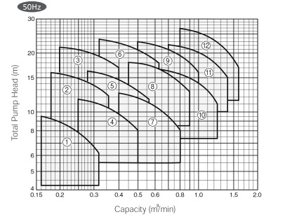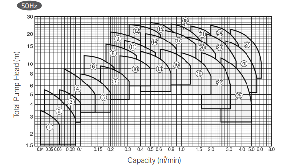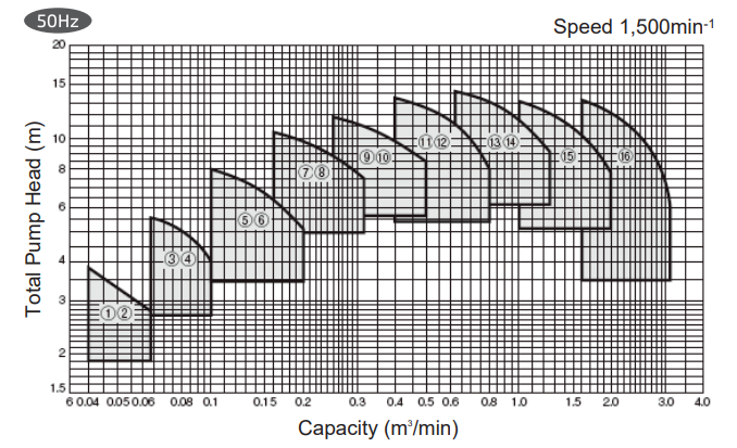 | No. | Bore (mm) | Model | rpm | PS | Capacity (m3/min) | Total head (m) | Capacity (m3/min) | Total head 4.5(m) | Capacity (m3/min) | Total head (m) |